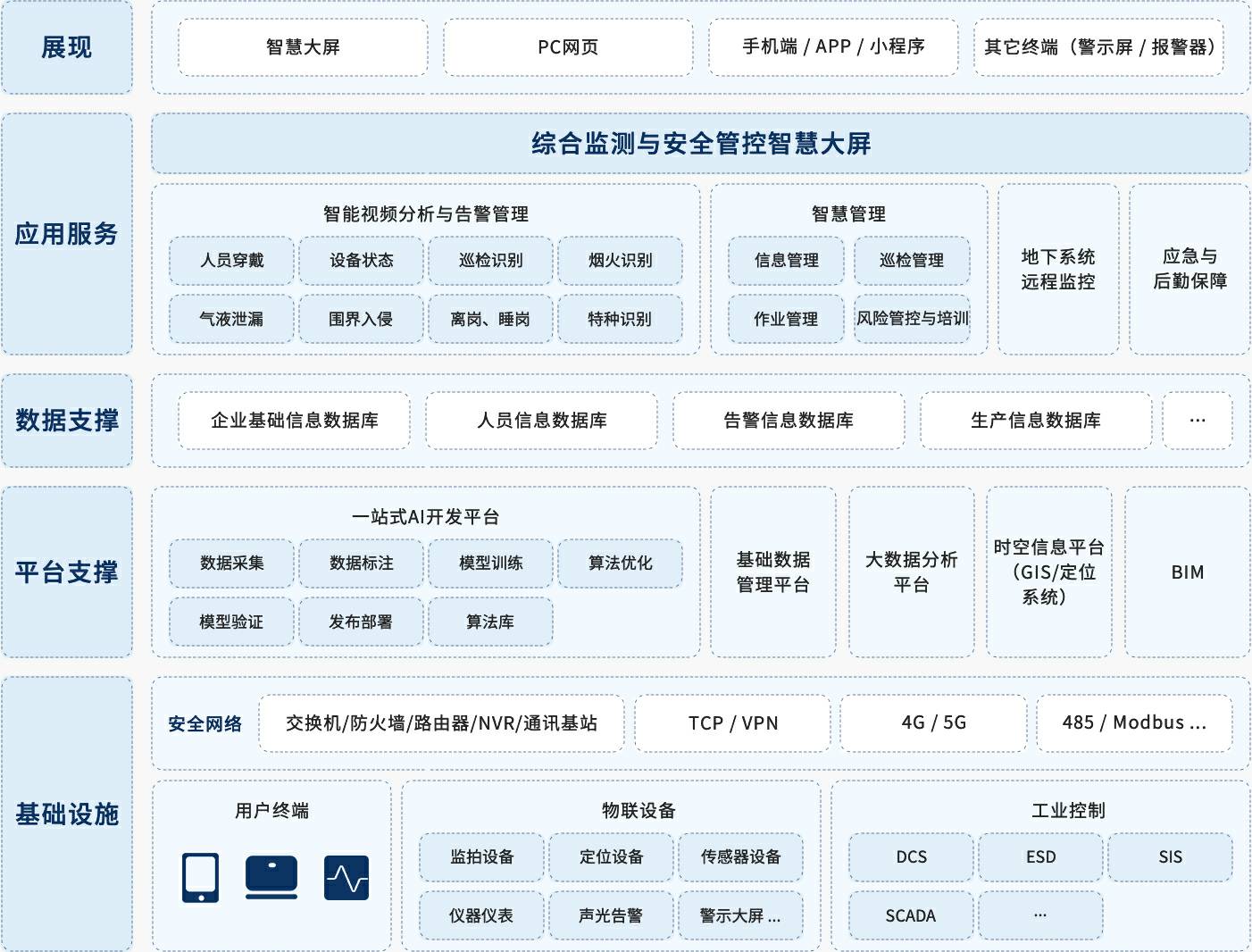 针对矿山安全生产的管理要求,紧抓需求痛点,星空体育·(中国)官方网站-登录入口创新提出“一基础、双支撑、多平台、N应用”的智慧矿山方案,实现不同阶段需求逐步实现未来智慧矿山。星空体育·(中国)官方网站-登录入口创新充分利用人工智能算法优势,从智能视频分析风险隐患切入,实现风险隐患全生命周期分析与管理,同时应用智慧化作业流程、智慧检维修提升作业生产效率,应急与后勤保障是重中之重,除了实现地下通风系统、定位系统、电力系统、通讯系统、排水系统以及环境监测系统的全天候监控之外,应急物资管理系统保障物资及时可用,人员设备定位系统保障下井人员位置的实时管控,充分实现应急后勤保障,星空体育·(中国)官方网站-登录入口创新智慧矿山方案永远将安全生产放在第一位。