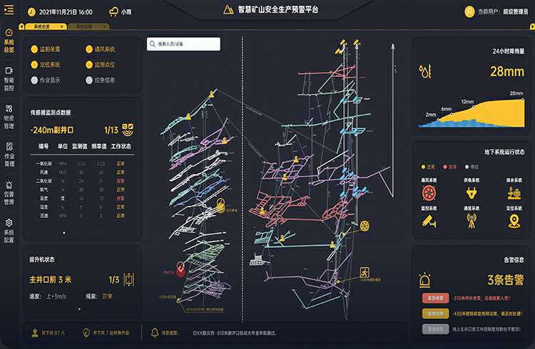 时刻监测地下通风系统、定位系统、电力系统、通讯系统、排水系统、升降系统以及环境监测系统数据,异常预警,同时支持远程控制,实现风险自动处理或人工干预